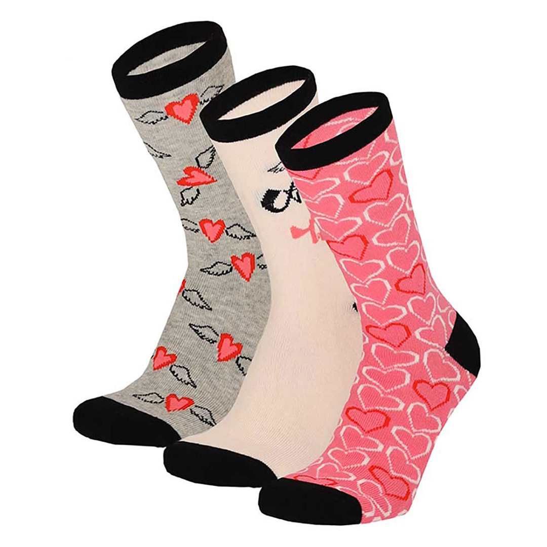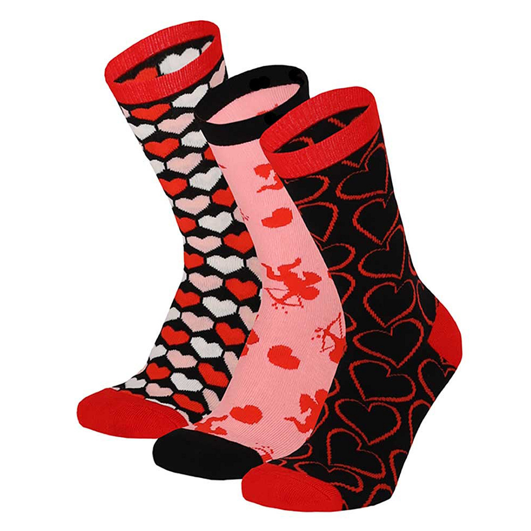 Drie paar comfortabele Love you damessokken van Apollo met hartjes en cupido prints, verpakt in mooie cadeaubox! Lees meer