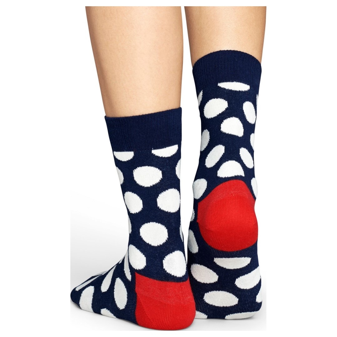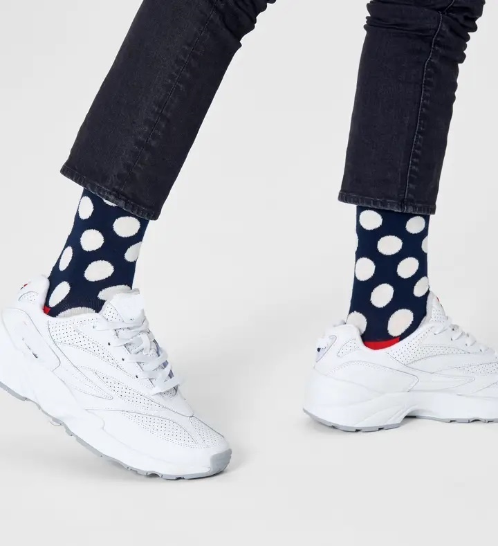Ga vrolijk de dag door met deze iconische Happy Socks big dot sokken in een marine blauw-wit-rood variant! De sokken hebben een print van stippen in het wit op marine-blauw met een rode hak als tof accent. Koop een paar voor jezelf of deel de stijl met een vriend! Gemaakt van zacht en ademend gekamd katoen.Voor hem en haar.